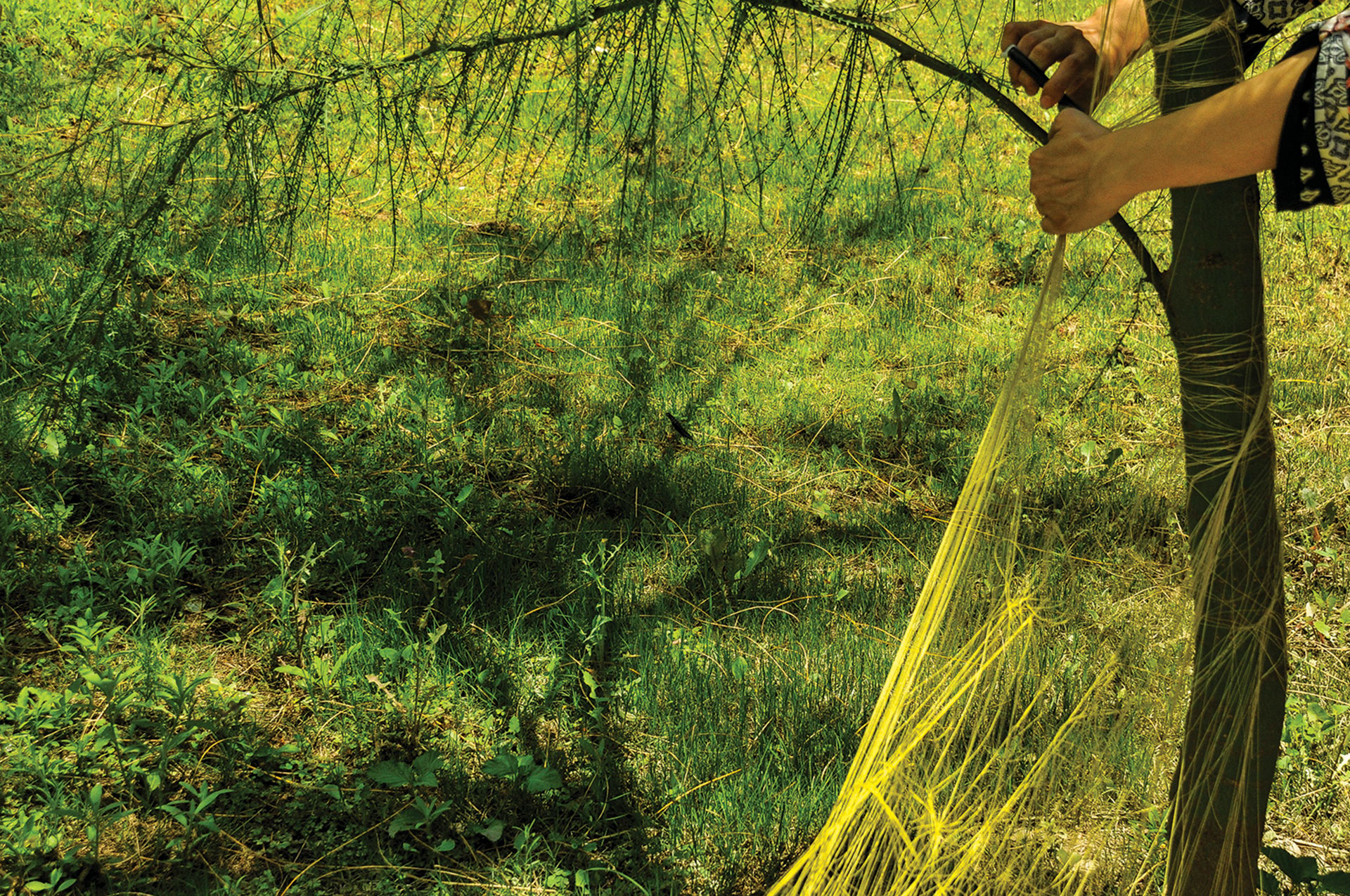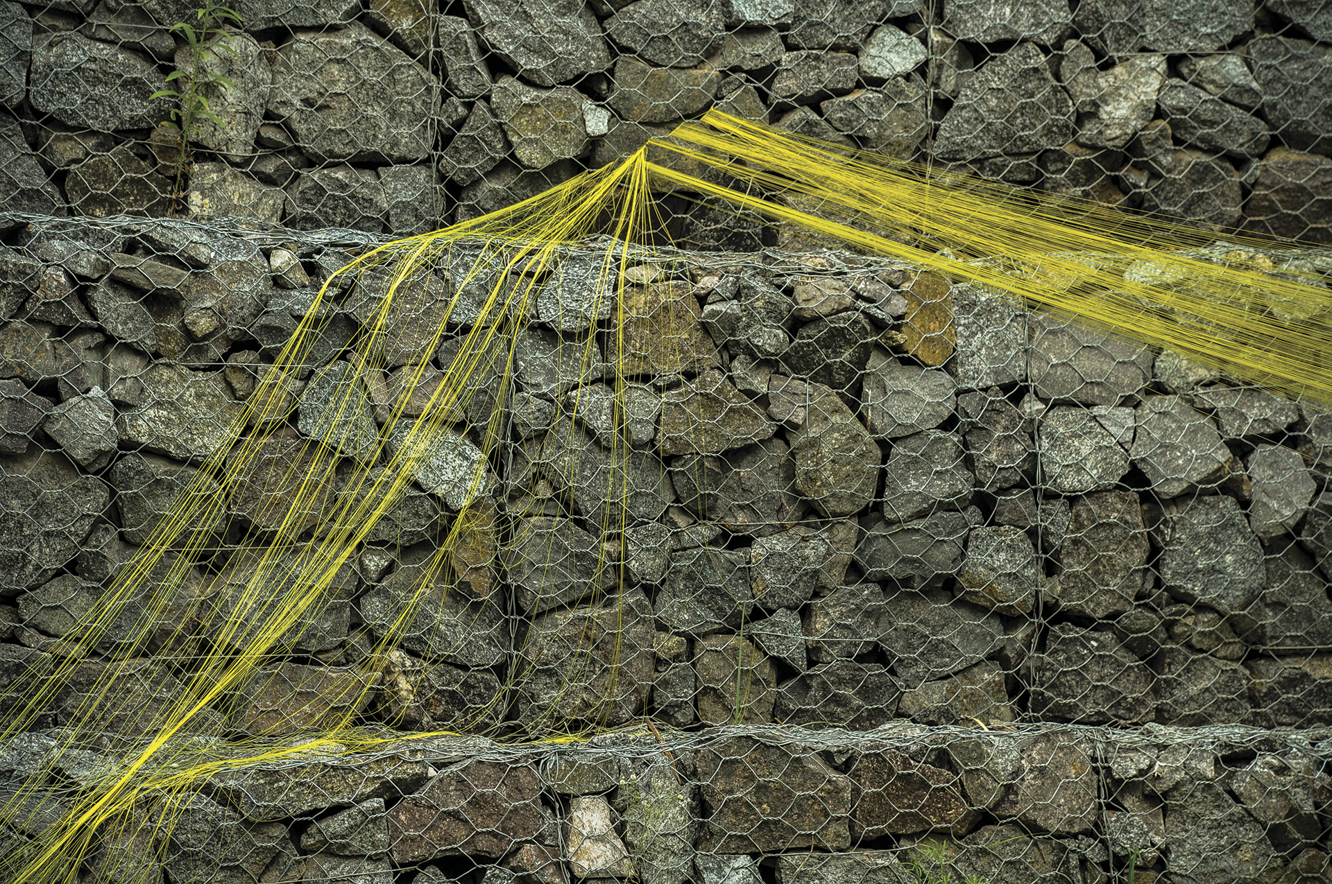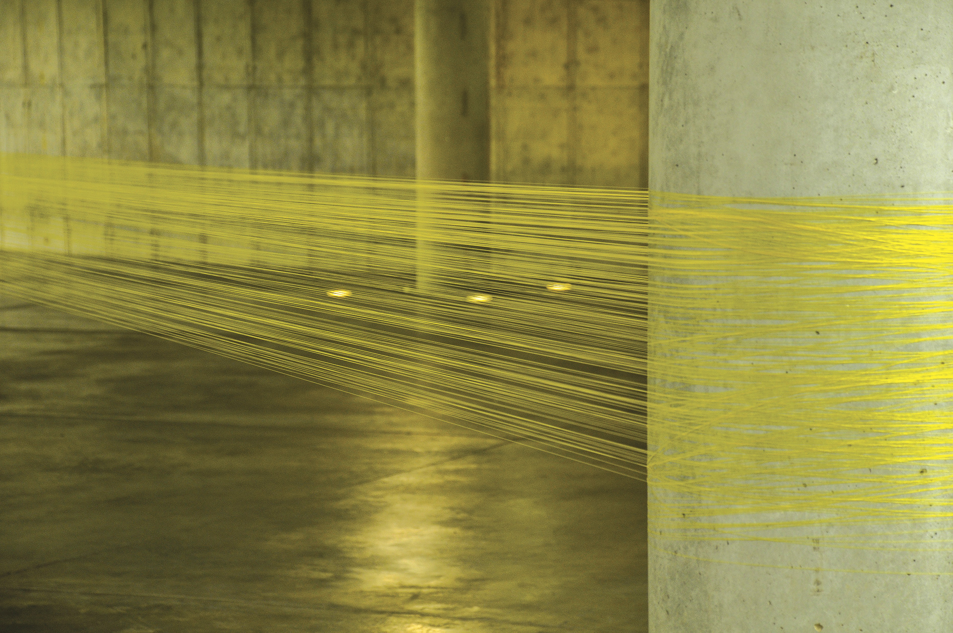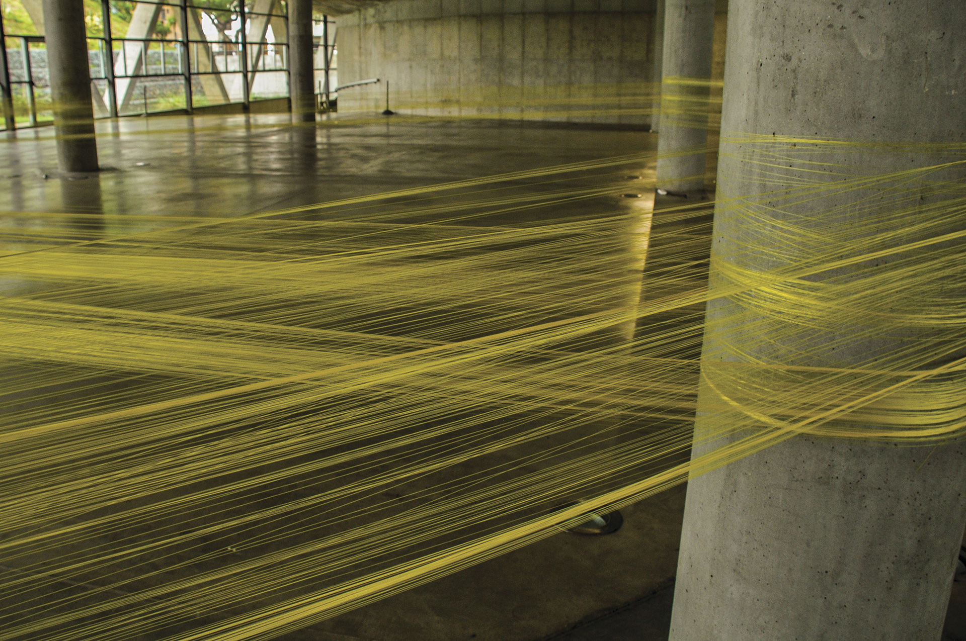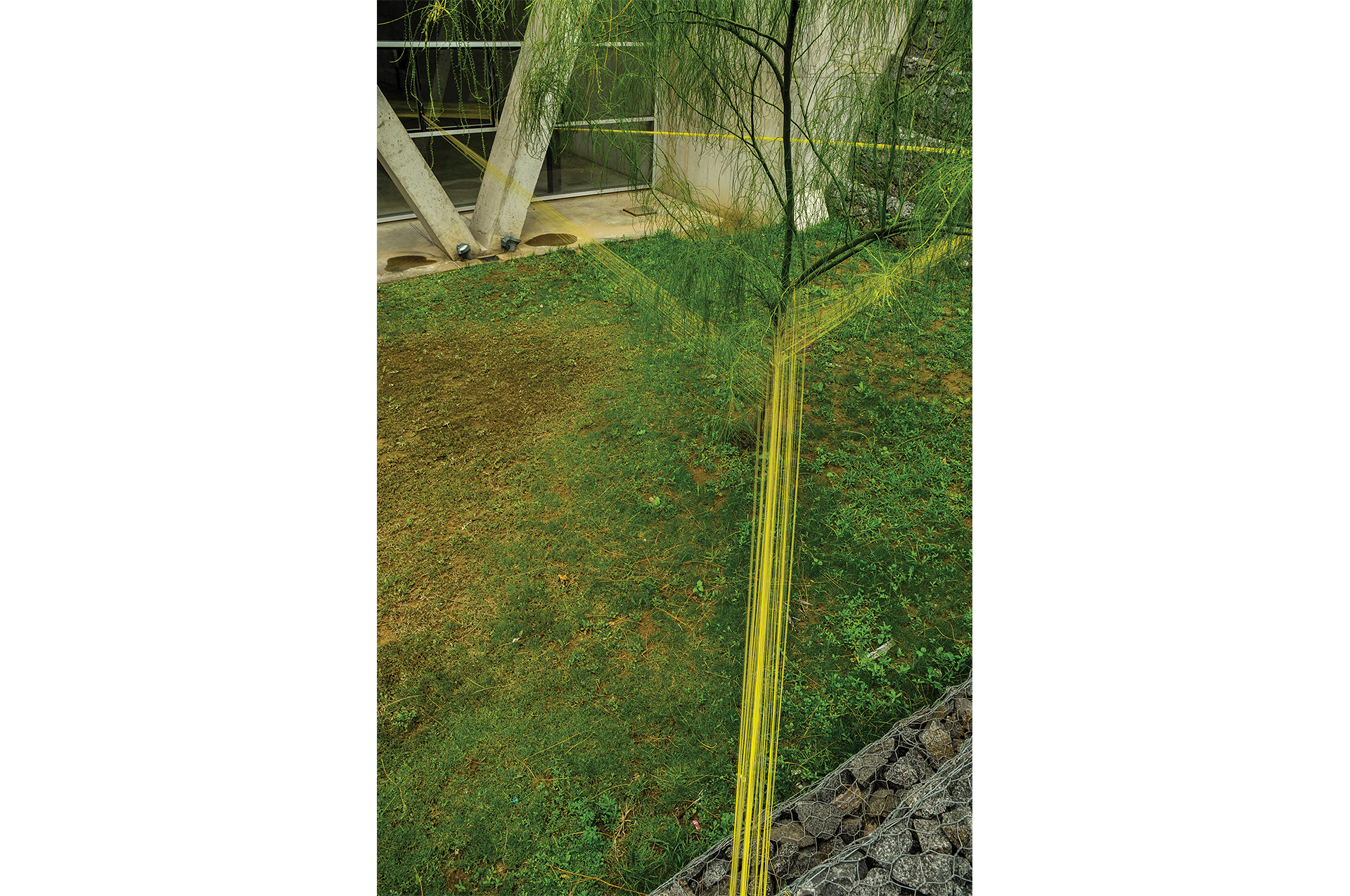 40.000 mts de hilo de fibra poliamídica amarillo oro recorriendo la arquitectura y conectando ésta con algunos árboles del jardín Superficie total interior y exterior intervenida 1126mts. Diez días de trabajo individual en Sitio. 100 metros lineales de recorrido.