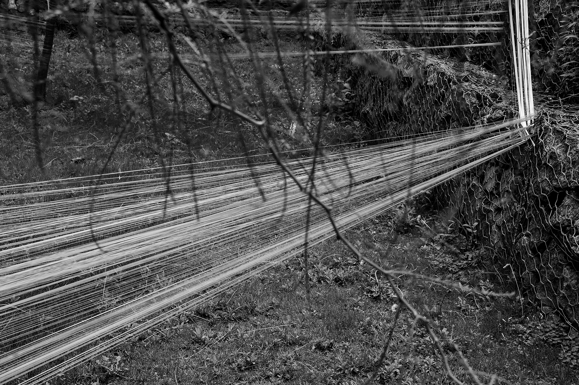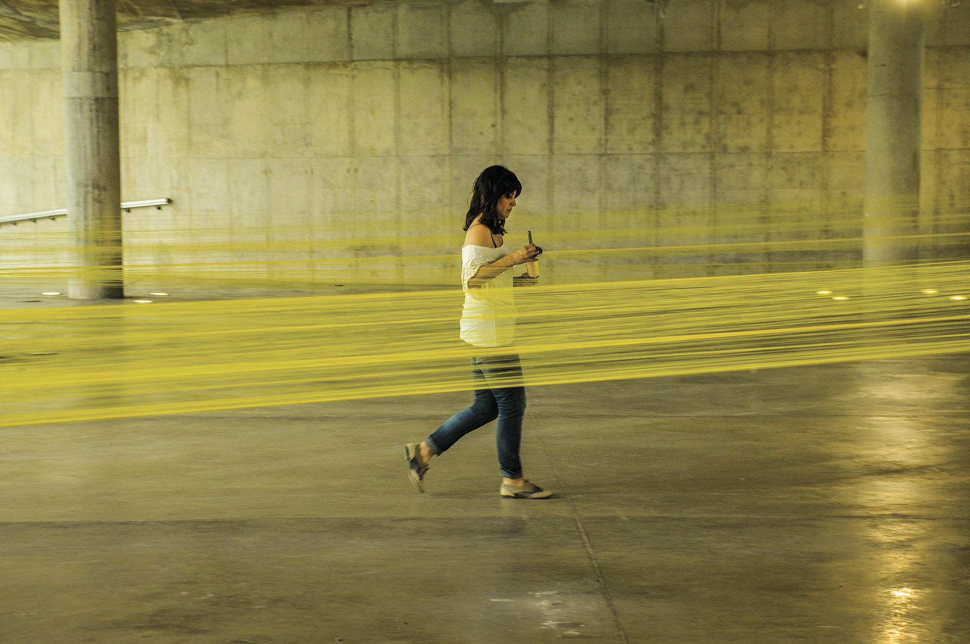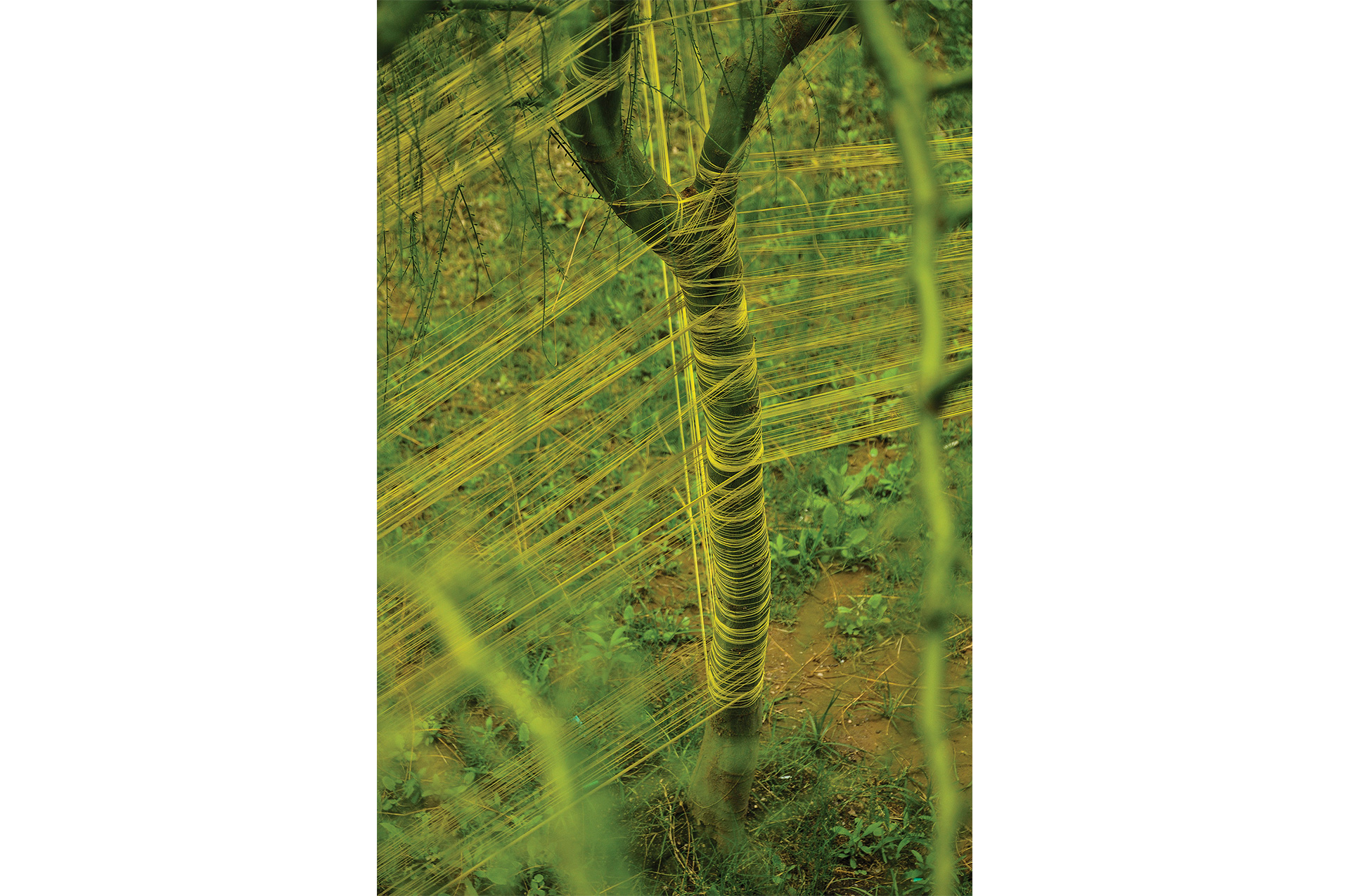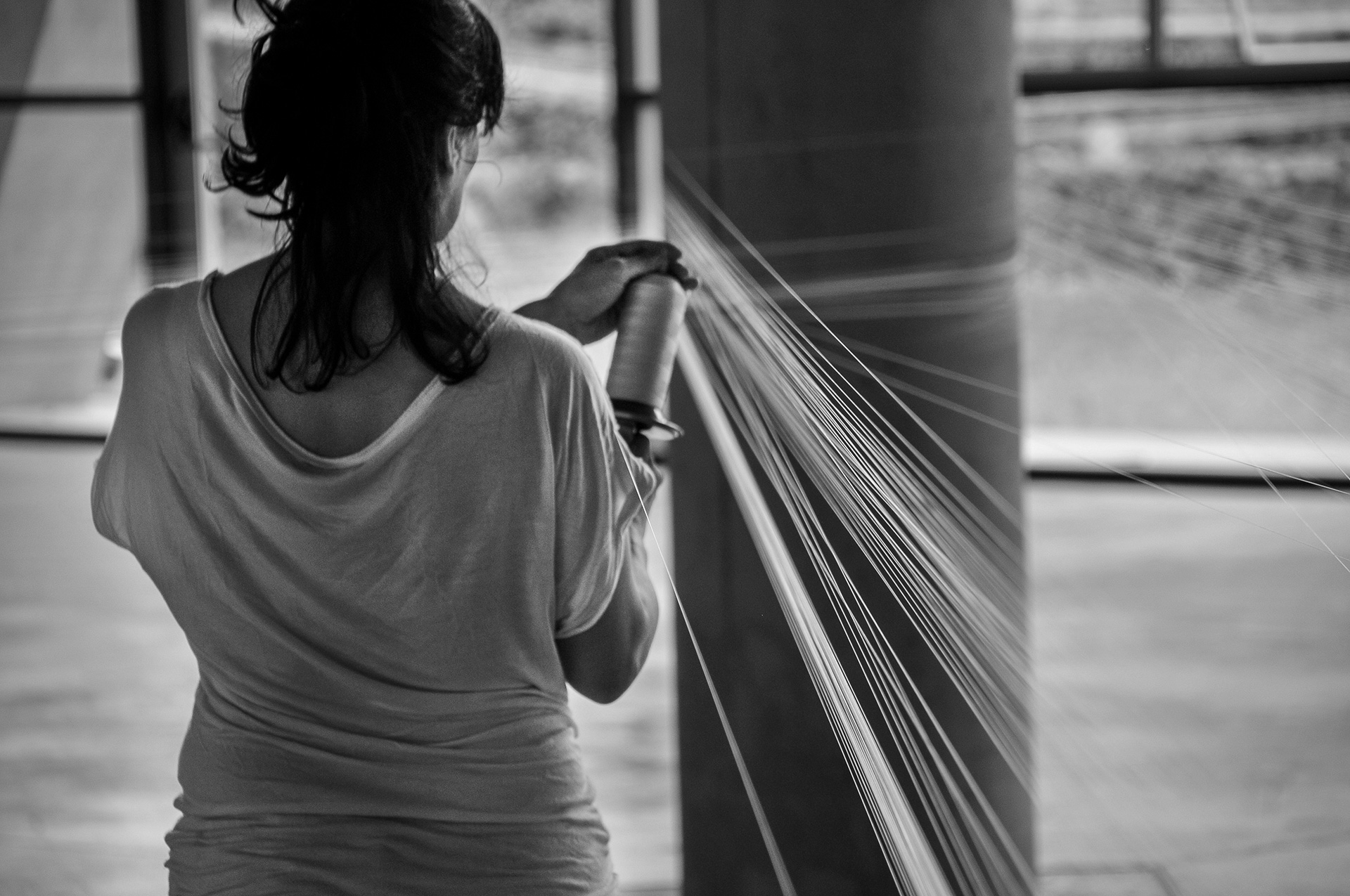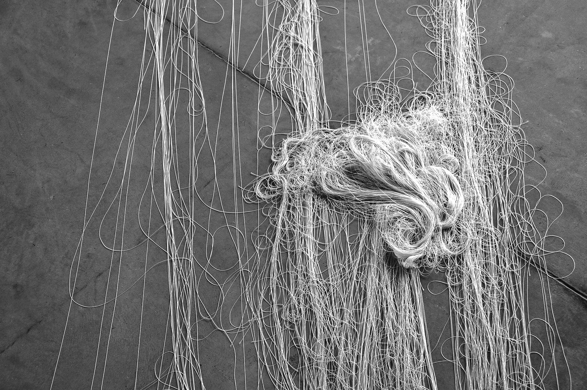 40.000 mts de hilo de fibra poliamídica amarillo oro recorriendo la arquitectura y conectando ésta con algunos árboles del jardín Superficie total interior y exterior intervenida 1126mts. Diez días de trabajo individual en Sitio. 100 metros lineales de recorrido.