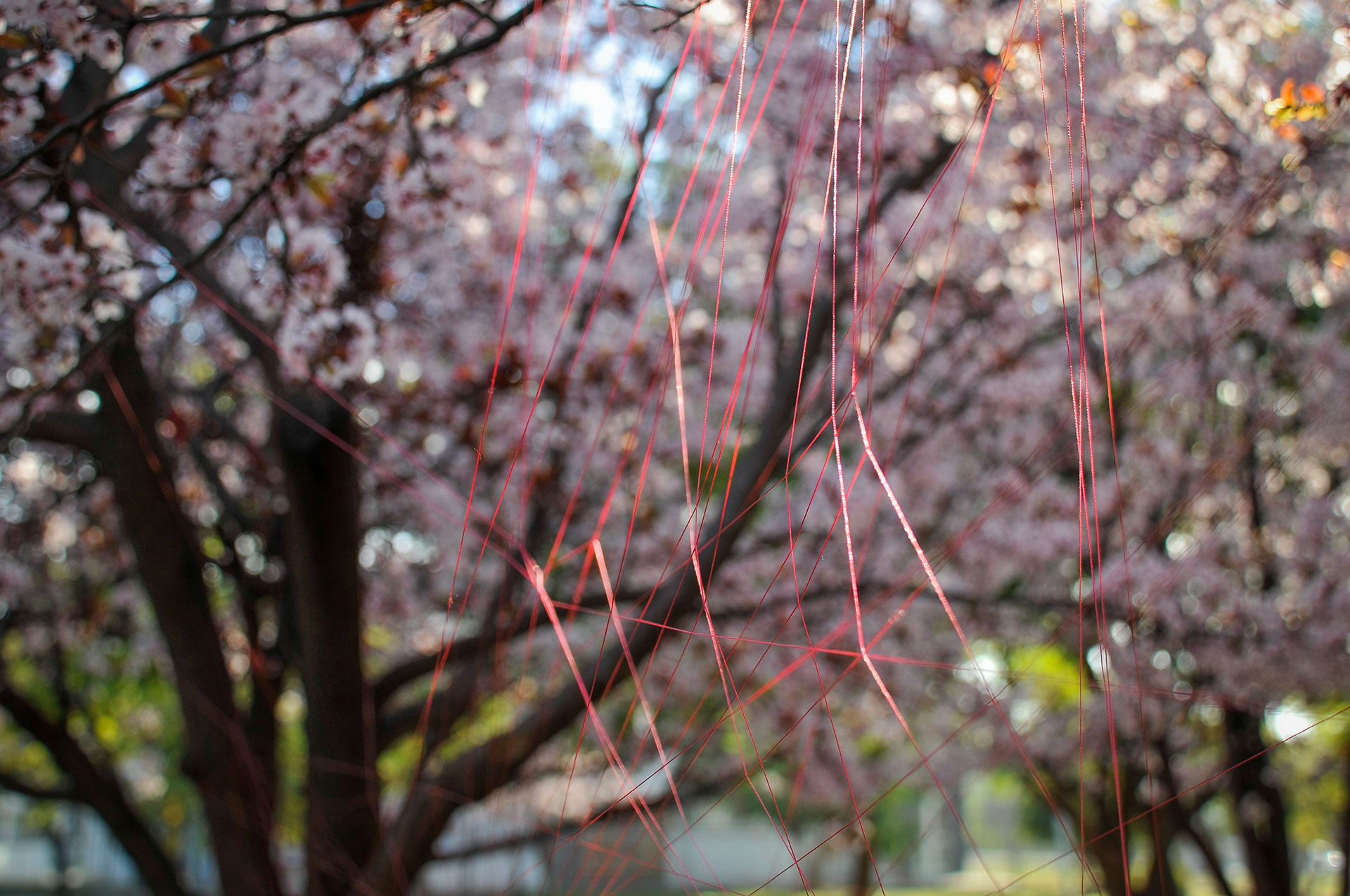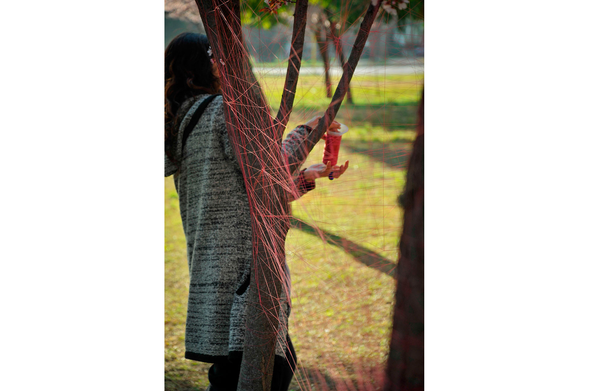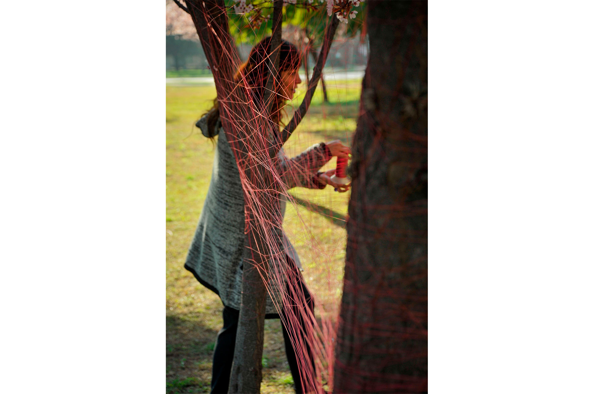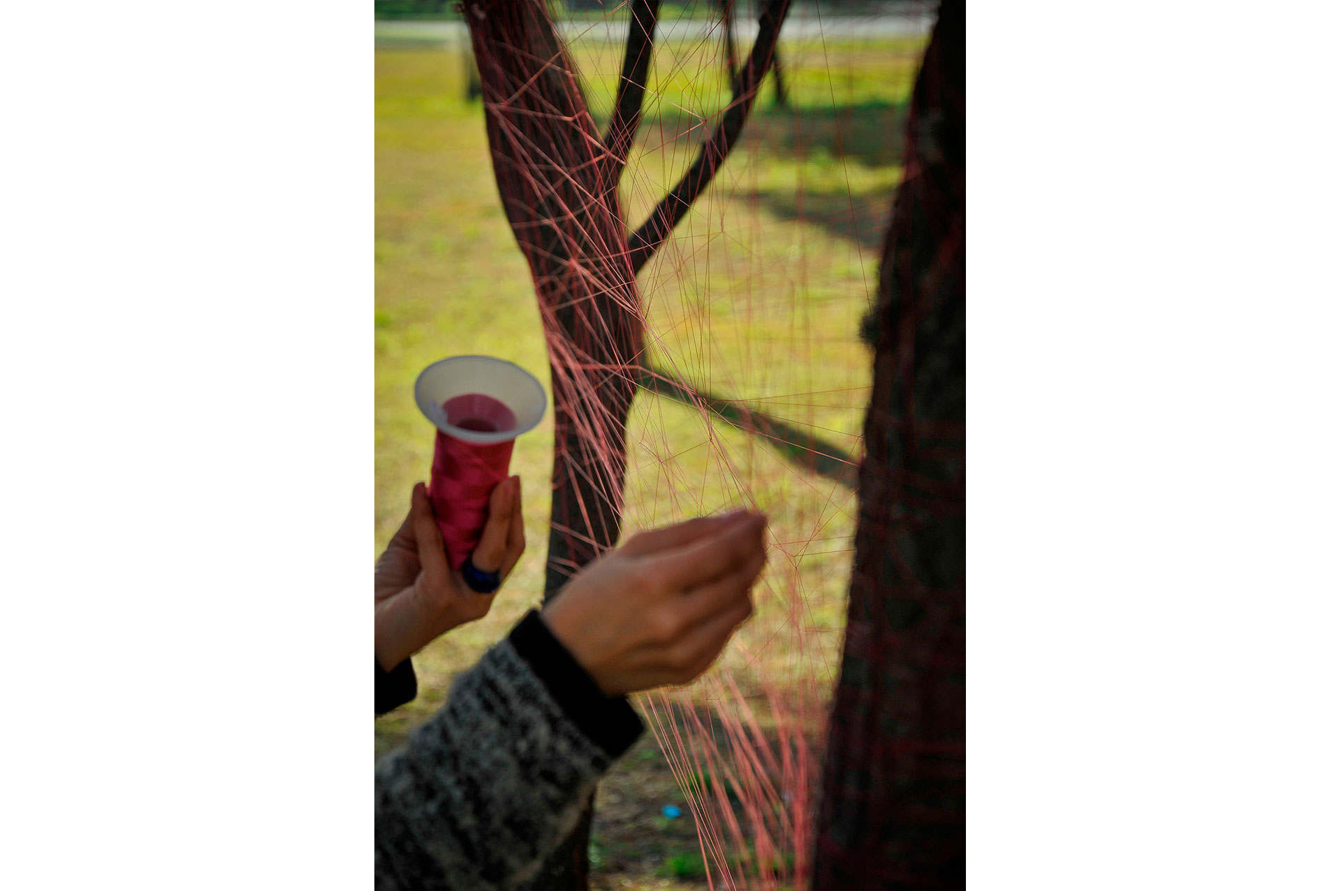 Utilizo hilos y la naturaleza como un medio perceptible a través de los sentidos para crear un espacio para la actividad y contemplación que apuntan a contextos mayores. Ritualización individual e íntima que puede comenzar una y otra vez, proceso íntegro conectado a un orden mayor.