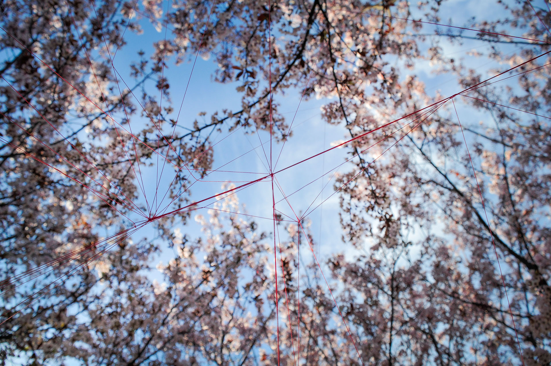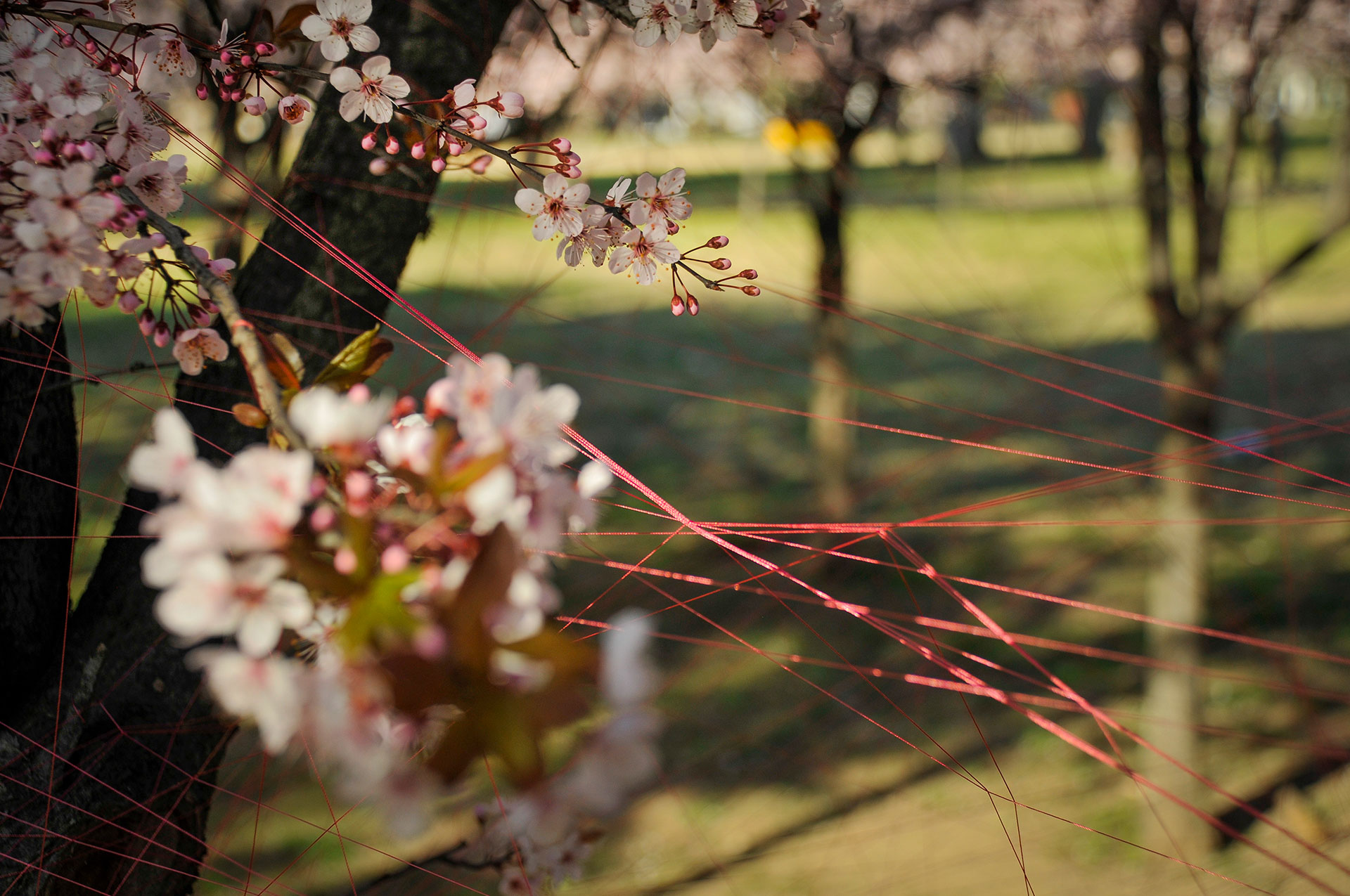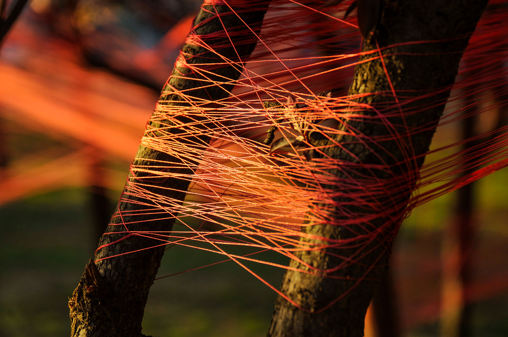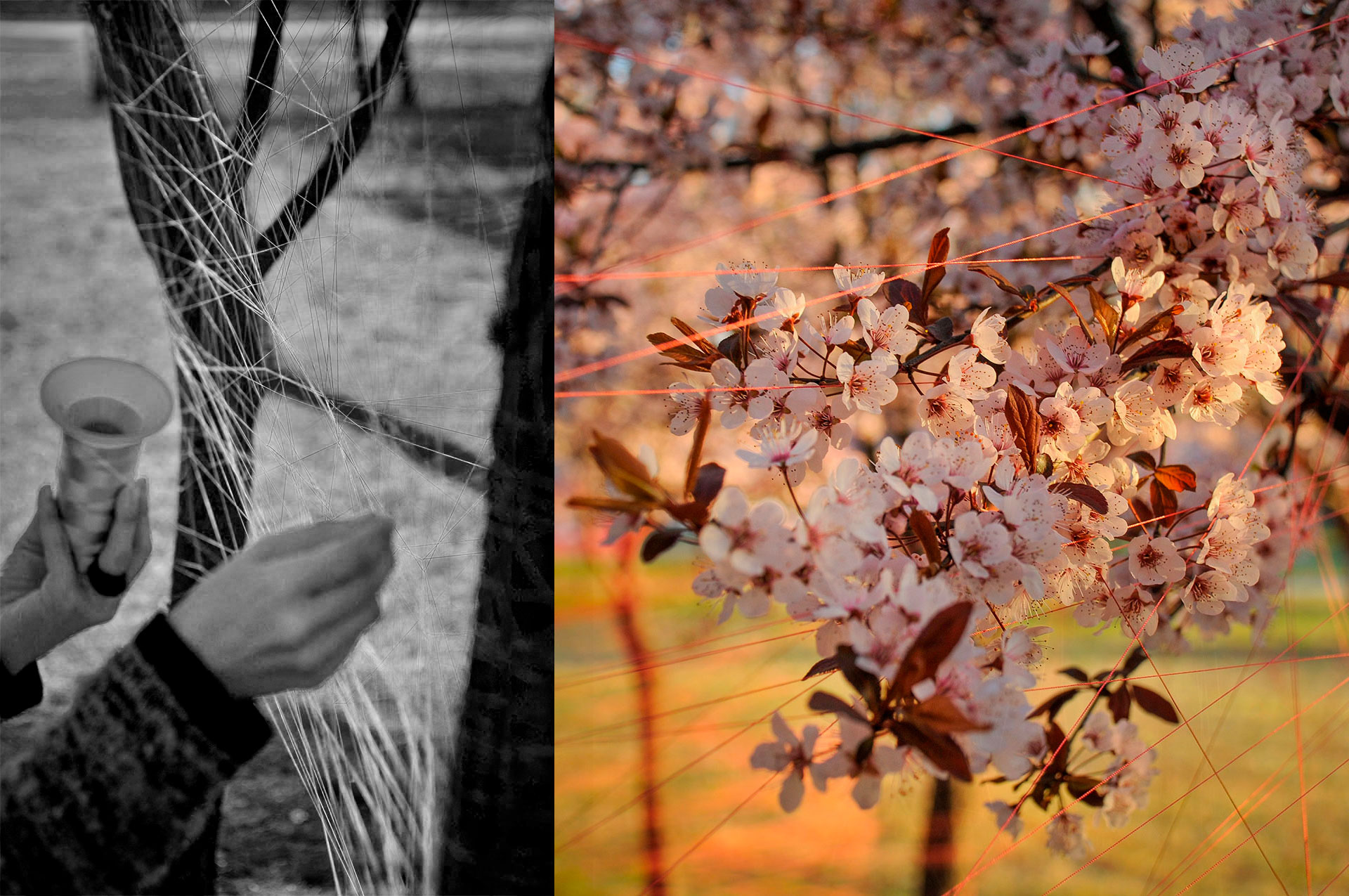 Utilizo hilos y la naturaleza como un medio perceptible a través de los sentidos para crear un espacio para la actividad y contemplación que apuntan a contextos mayores. Ritualización individual e íntima que puede comenzar una y otra vez, proceso íntegro conectado a un orden mayor.
