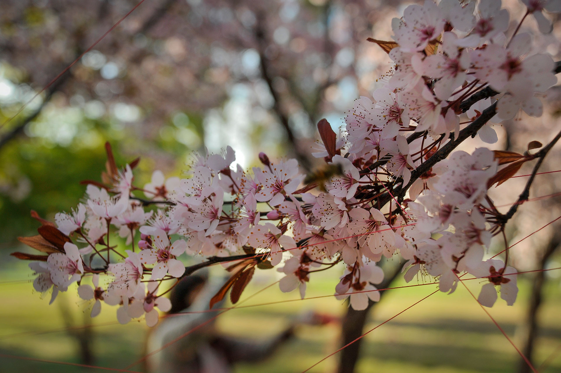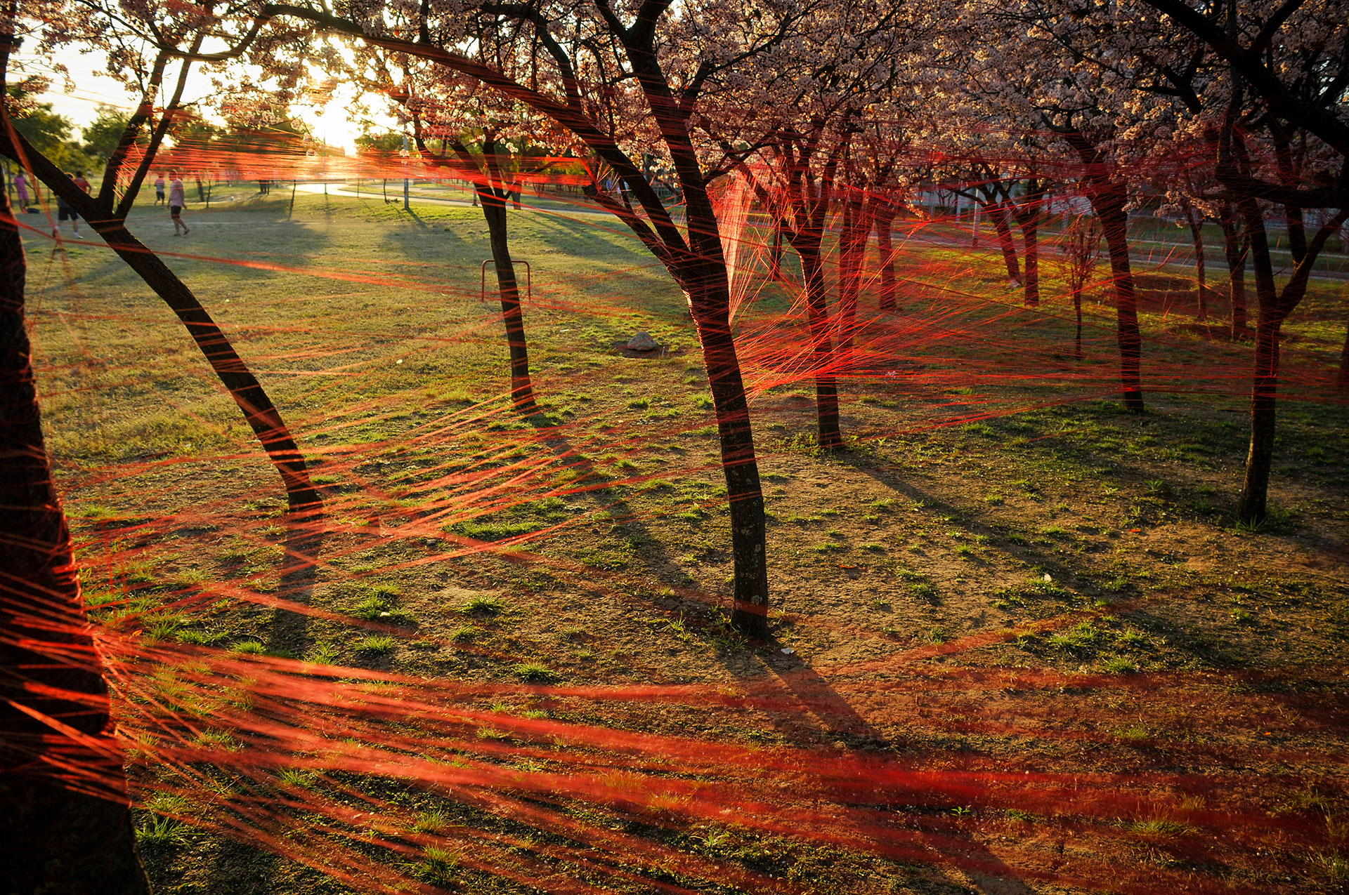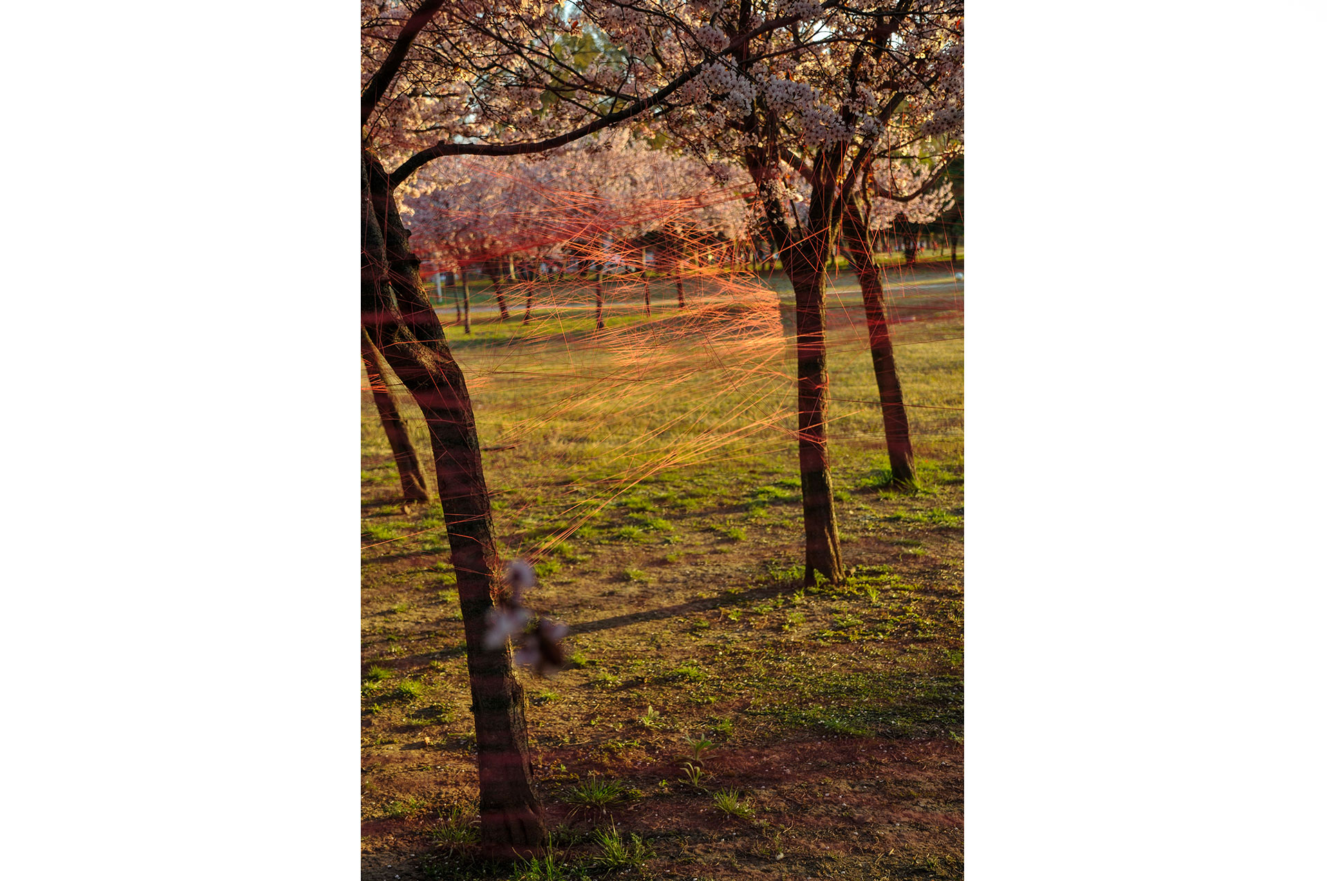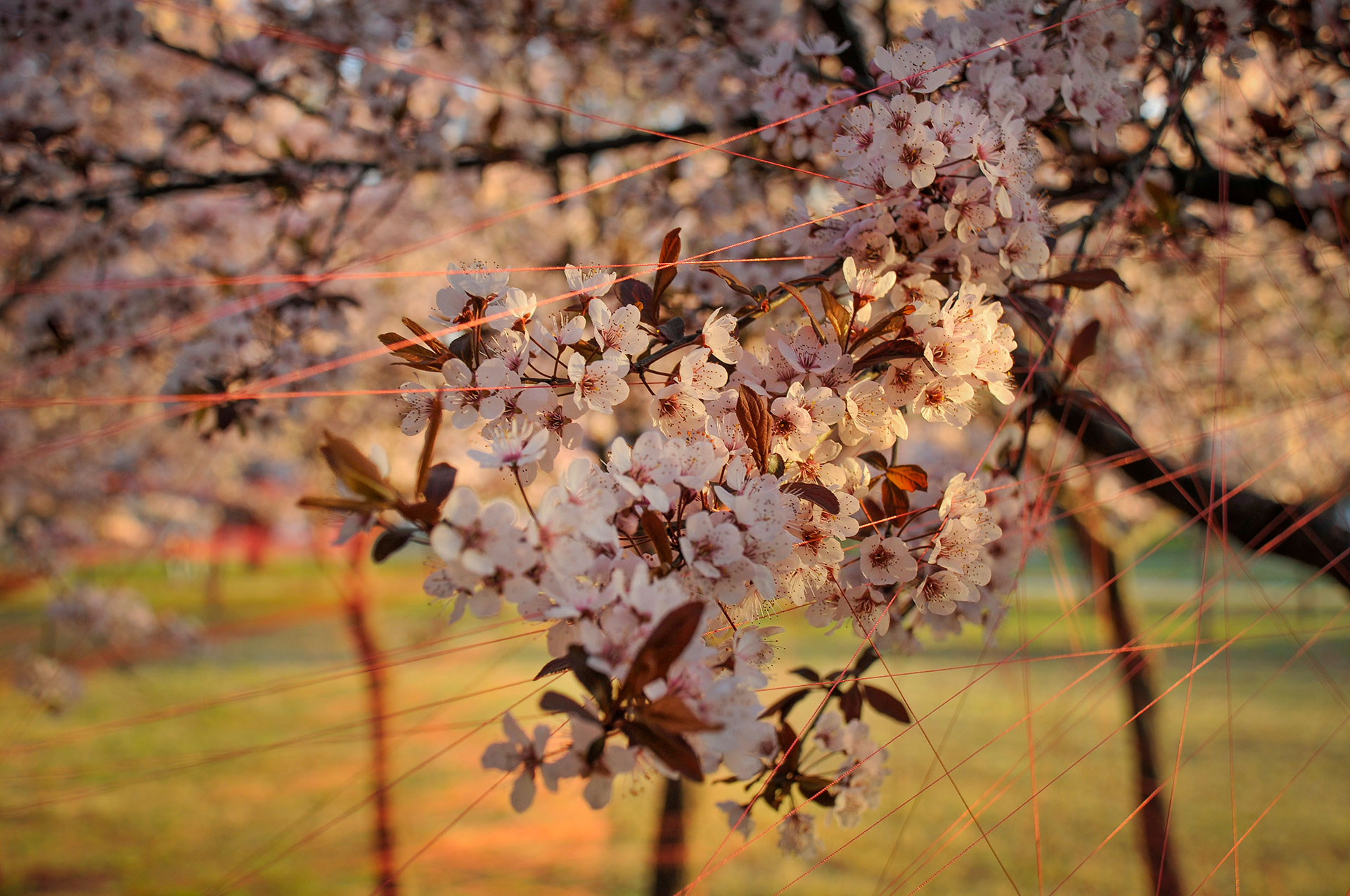 Utilizo hilos y la naturaleza como un medio perceptible a través de los sentidos para crear un espacio para la actividad y contemplación que apuntan a contextos mayores. Ritualización individual e íntima que puede comenzar una y otra vez, proceso íntegro conectado a un orden mayor.