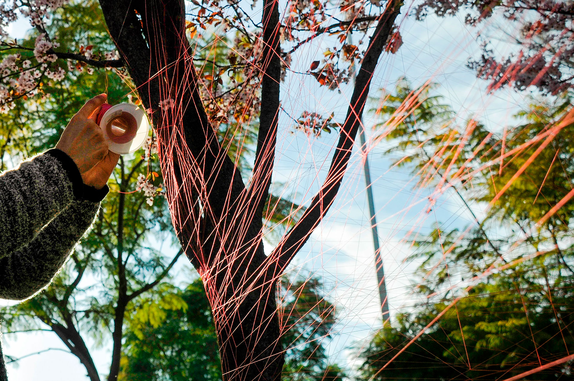 16,000mts de hilo de fibra poliamídica, conectando ramas de árboles, tiempo de ejecución tres días.